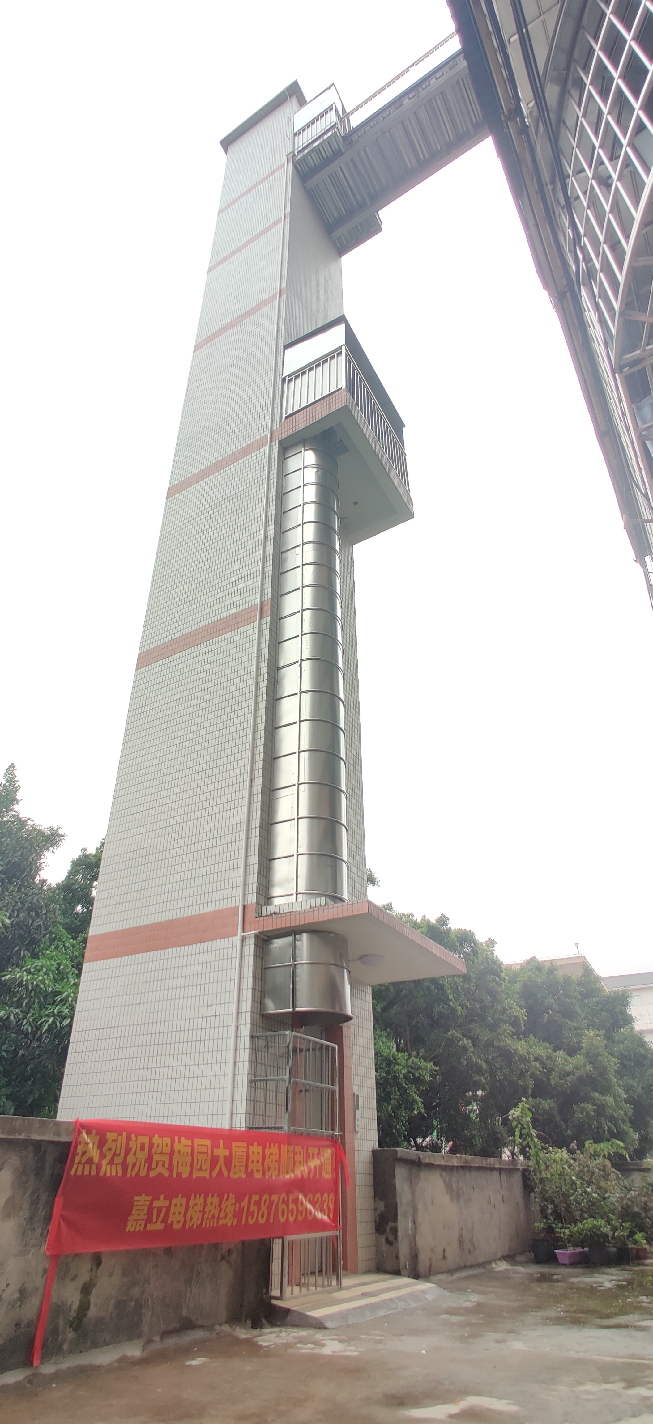加装电梯大家见得多了,有平层停的也有上下半层的设计方案,9 层楼只停 3层的设计就挺少见的。近日位于广州大道北梅园大厦的 1299 号顺利完工投入使用的加装电梯,就是采用了这种少见的设计方案。
