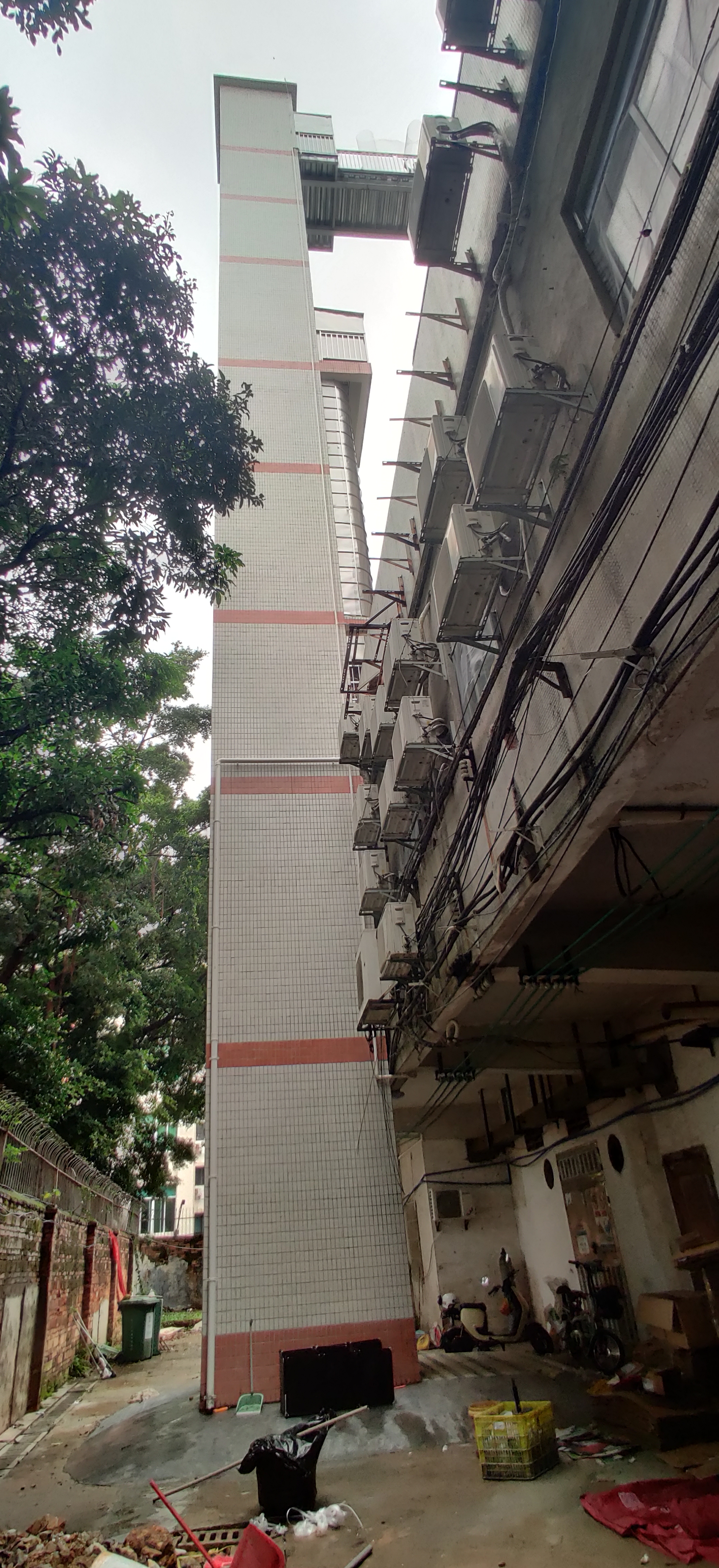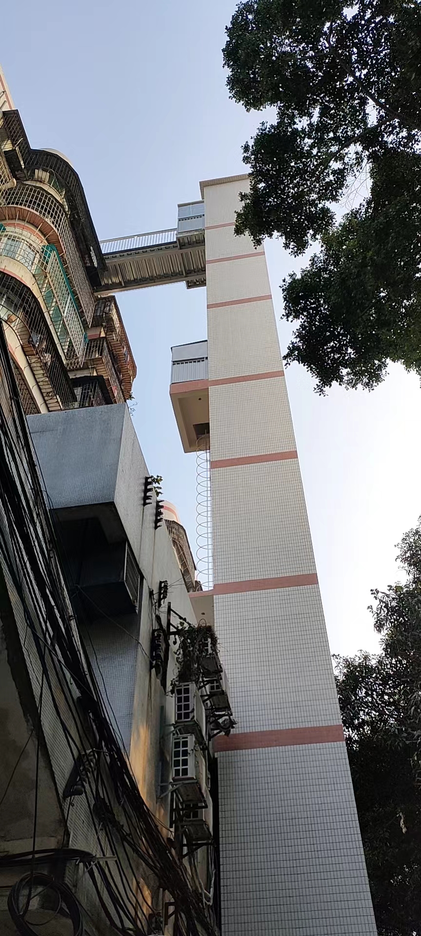 梅园大厦是栋建成于1994年的老楼,六个单元共有一个平台,因为其建筑结构特殊的缘故,每单元3~9 层楼梯转角平台是承重梁,如借用于连廊接驳会影响到楼体结构安全;又因阳台入户方案住户阳台侧是人行道跟大马路,也无法加装。